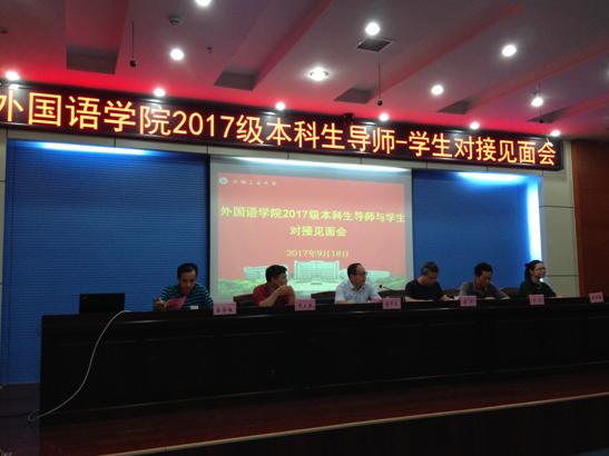 9月18日下午,外国语学院在秀山校区图书馆第一报告厅召开2017级本科生导师与学生对接见面会。副校长葛芦生,教务处、外国语学院负责同志、2017级导师、辅导员、班主任及全体本科生参加了会议。会议由院党委副书记、学生副院长黄宇弦主持。