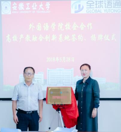 接着,葛芦生与谷菲分别代表安徽工业大学和全球语通签订了合作协议,并共同为“高校产教融合创新基地”揭牌。