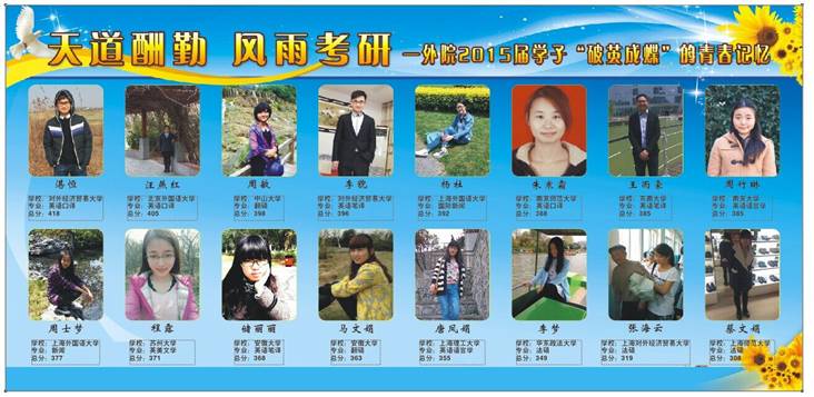 日前,2015年研究生录取结果已经揭晓,外国语学院学子经过顽强拼搏,喜获佳绩,取得了历史性的突破。本次考试,学院共有27名同学达线,达线率为27%,其中,400分以上2人、380分以上9人,录取到南京大学、北京外国语大学、上海外国语大学、对外经济贸易大学、华东政法大学、东南大学、中山大学等国内知名985、211学校人数占录取学生数的81.39%。