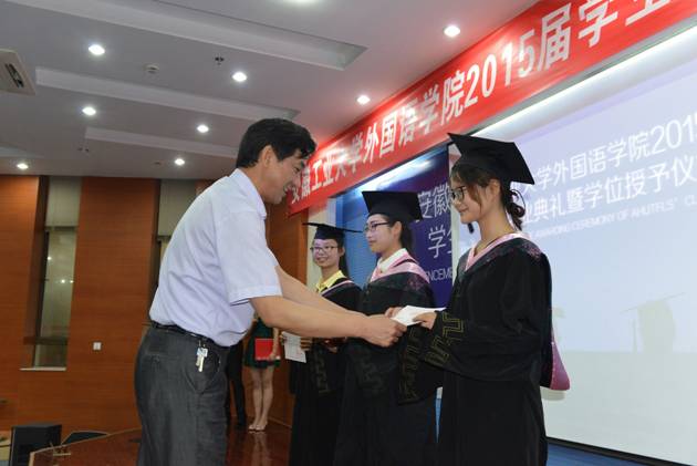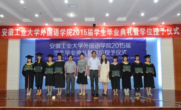随后,毕业生典礼暨学位授予仪式在雄壮的国歌声中拉开序幕,学院党委书记宋洪生宣读了学院2015届安徽省品学兼优毕业生和2015届安徽工业大学优秀毕业生的表彰决定。导师代表英语系副主任马广利博士,毕业生家长代表朱寒霜同学的父亲,毕业生代表赵继敏,在校生代表王敏先后发言,他们的发言充满了对安工大的感激之情,对母校的依依不舍,对毕业生的深深祝福。外国语学院院长洪流宣读了2015届毕业生中获文学学士学位同学名单。