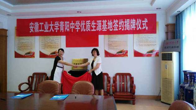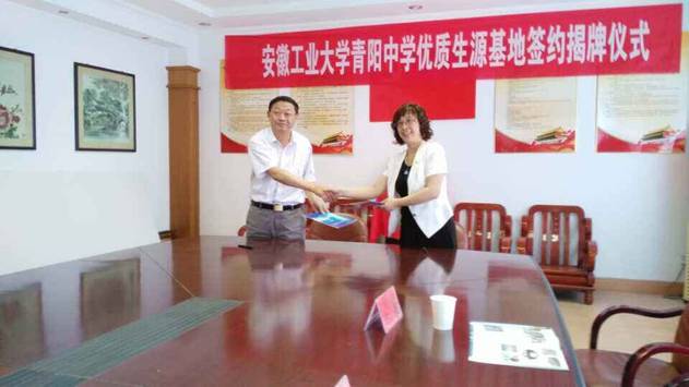 6月25日,我校在青阳中学举行了“安徽工业大学优质生源基地”揭牌仪式,并签订了合作协议。顾明言副校长、外国语学院党委书记宋洪生、副书记副院长李克明,体育教学部副主任赵家贵和青阳县副县长王诗琴、青阳中学校长郭安南、副校长刘东方、卢志海出席了签约揭牌仪式。