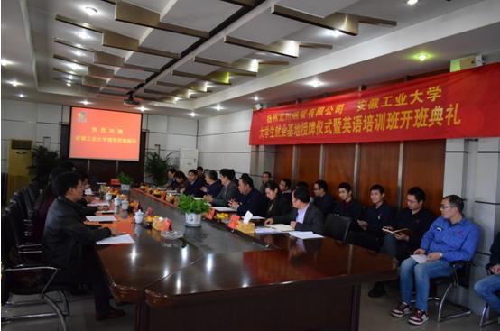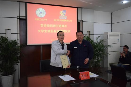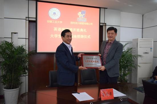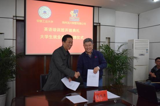 仪式上,陈润向马自强授牌,建立安徽工业大学-龙川钢管有限公司“大学生就业基地”。校就业中心主任丁忠利介绍了我校大学生就业工作和就业基地建设情况,校企双方签订了人才供需合作协议。