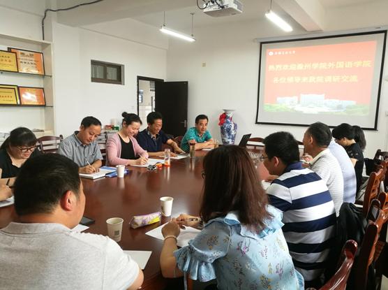 6月2日下午,滁州学院外国语学院院长程家才、副院长祁世明、副院长葛厚伟一行来我校调研交流本科教学工作审核评估评建工作。外国语学院院长洪流主持交流会,学院党委副书记、副院长黄宇弦,副院长曹瑞斓及各系部室负责人参加了座谈交流。