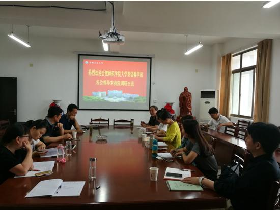 6月14日,合肥师范学院大学英语教学部主任曹军、主任助理张雪迟一行7人来我校调研交流本科教学审核评估和大学英语教学改革等工作。外国语学院院长洪流主持交流会,大学英语教学部负责人等参加了座谈交流。