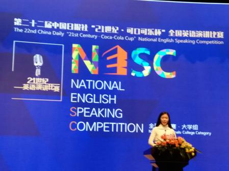 3月24至26日,第二十二届中国日报社“21世纪•可口可乐杯”全国英语演讲大赛全国总决赛在南京大学(仙林校区)举行。经过激烈角逐,我校外国语学院闫心蕊同学从来自全国各高校(含港澳台)的近70名优秀选手中脱颖而出,荣获全国二等奖。