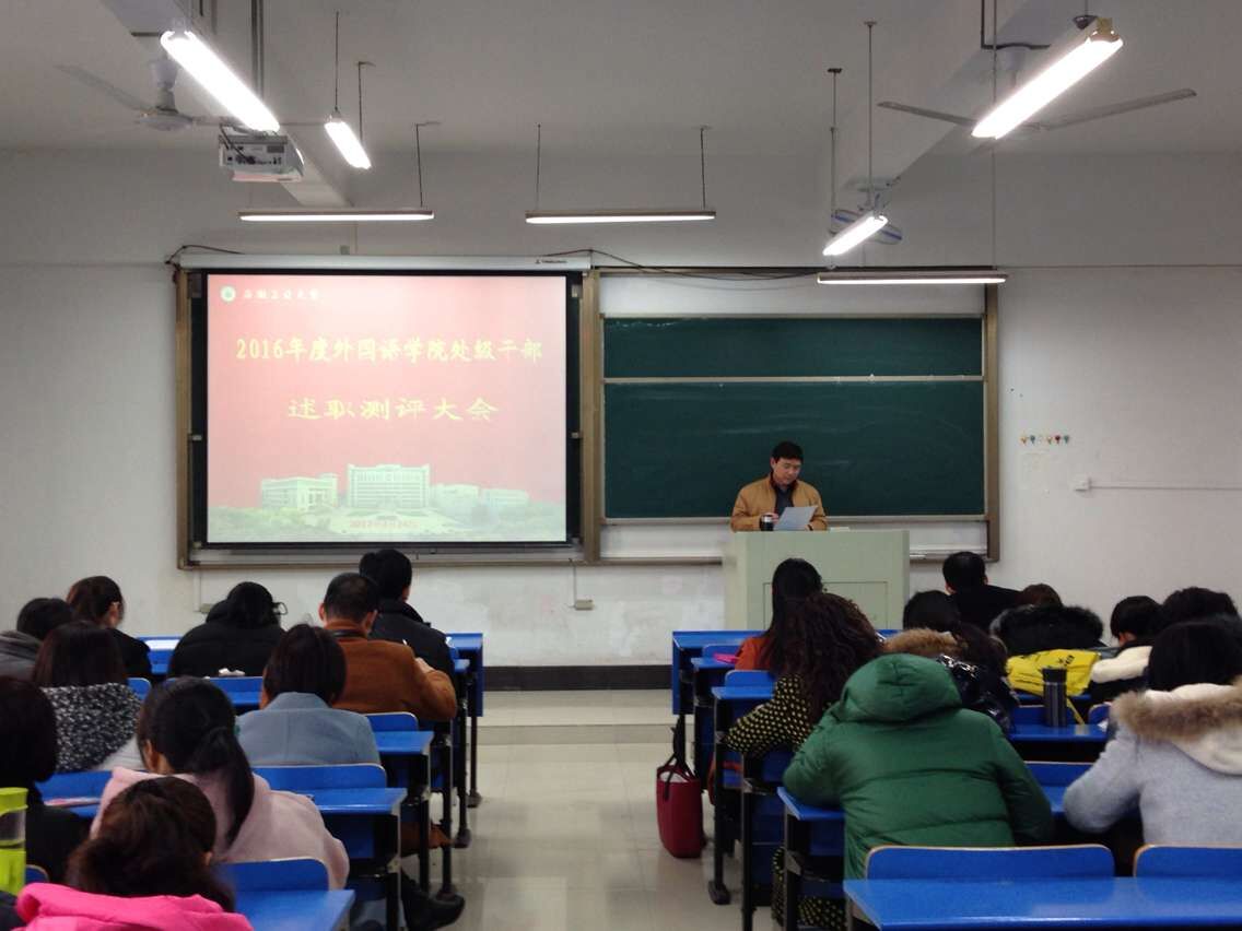 2017年2月24日下午,外国语学院召开全体教职工和学生代表大会,根据学校党委的统一部署,对学院工作及学院领导班子成员进行年度考核,并同时对副院长曹瑞斓进行试用期满考核。校第七考核组组长、校党委常委、组织部部长刘明,校宣传部副部长邹珏,校纪委副处级纪检员杨卫兵到会开展了民主测评,并同相关人员进行了个别谈话。院党委书记胡卫东主持了大会。