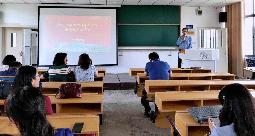 5月10日下午,外国语学院召开2021年第三次全体教职工大会,通报并布置了学院近期工作。学院全体教职工参加了会议,会议由院党委书记黄宇弦主持。