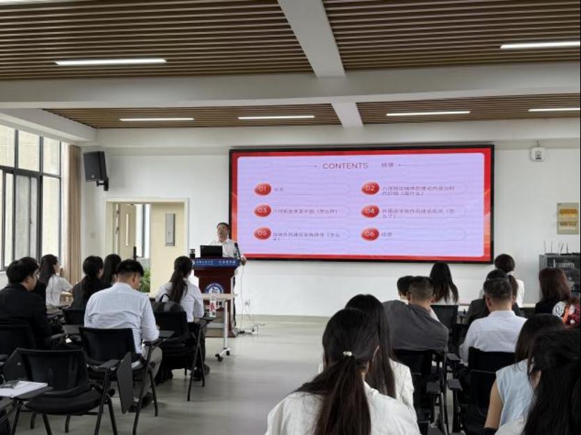 王成勇从深刻把握中央八项规定精神的理论内涵与时代价值、八项规定改变中国、从中华优秀传统文化到革命文化、新时代外国语学院作风建设存在的问题与不足、外国语学院师生党员加强作风建设的实践路径等五个方面,系统阐述了如何让中央八项规定精神在外国语学院落地生根,为学科建设和人才培养注入清风正气。