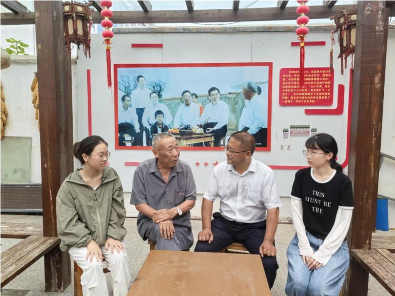 师生们围坐在关友江同志身旁,他朴素的布衣上沉淀着岁月的痕迹,慈祥的笑容里刻满风霜的印记。身后墙上是一张斑驳的照片,无声诉说着历史——2008年9月30日上午,胡锦涛总书记来到凤阳县小岗村,在关友江家的农家小院里,与沈浩、关友江、严金昌等围坐畅谈。
