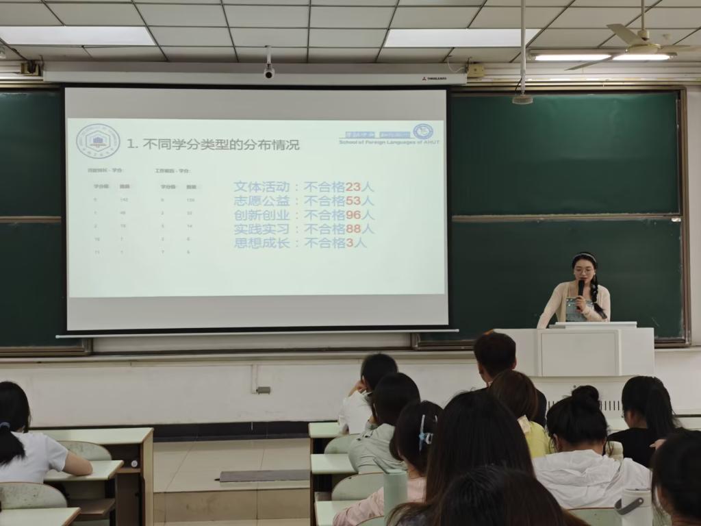 会议伊始,张庆芳对2023级各班级学业表现进行详细剖析,肯定了取得的成绩,也指出了普遍存在的薄弱环节,提醒同学们要对标培养方案,认真核查个人学分修读情况,特别是专业必修课、实践教学环节及各类模块选修课的完成进度。针对第二课堂学分达标情况,会议明确了当前各类型学分的不合格人数分布,张庆芳建议学生提前规划,主动参与各类活动,在丰富经历的同时确保学分达标,全面提升综合素质。