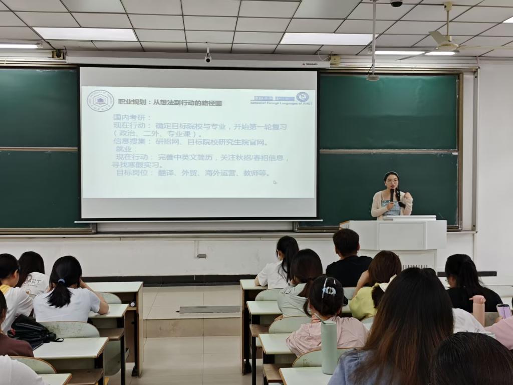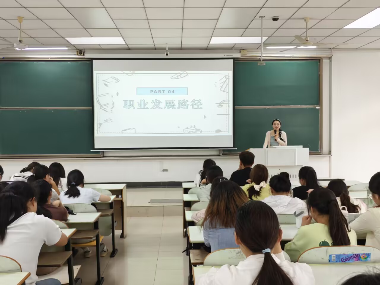 随后,张庆芳就职业发展路径规划从升学、就业、考公考编等多个维度具体行动指南。张庆芳结合学院近年来升学就业形势,介绍了学院往届毕业生的主要去向,鼓励同学们尽早明确目标方向,她强调,大三阶段是进行职业探索和决策的关键期,同学们应主动获取信息,积极利用学校学院提供的各类资源,为未来做好充分准备。