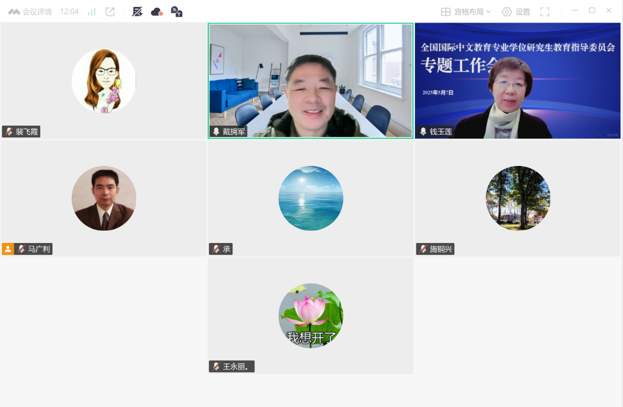 2025年11月25日,外国语学院邀请南京师范大学钱玉莲教授为评估专家,对国际中文教育专业硕士学位授权点进行评估。学院党委书记王成勇、院长戴拥军、科研副院长马广利、党委副书记施铜兴、学位点负责人王永丽等参加会议,会议由戴拥军主持。此次会议通过腾讯会议线上开展,旨在对外国语学院国际中文教育专业硕士学位授权点进行全面、深入的评估与研讨,查找问题与不足,推动学位点的建设与发展。