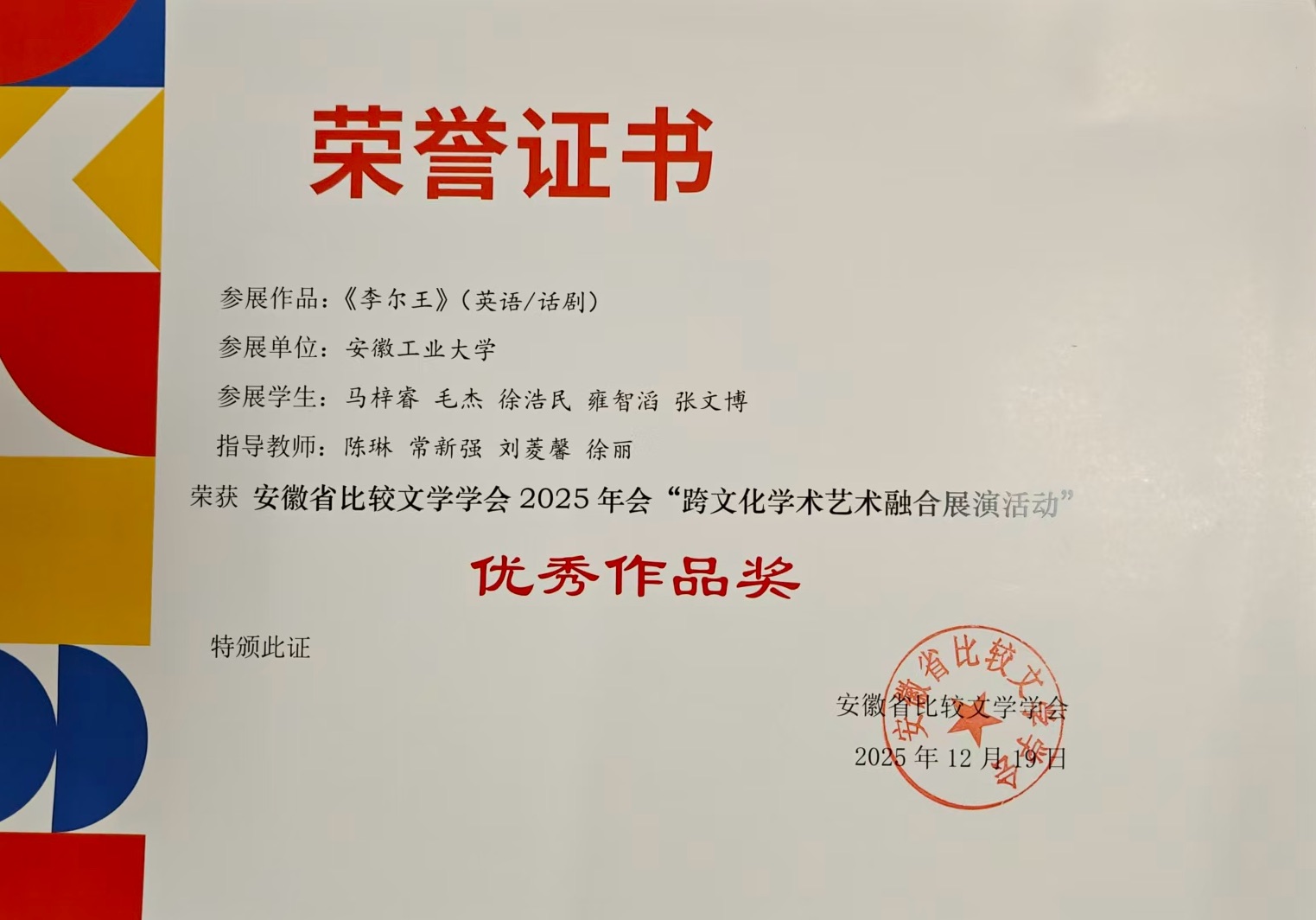 2025年12月19-21日,安徽省第五届比较文学学会年会在黄山学院举办。上海外语教育出版社协办此次年会,并成功举办了“跨文化学术艺术融合展演”“跨文化能力提升工作坊“等特色活动。外国语学院《李尔王》与《卢纳萨之舞》剧组受邀参加“跨文化学术艺术融合展演”活动,并获优秀作品奖。