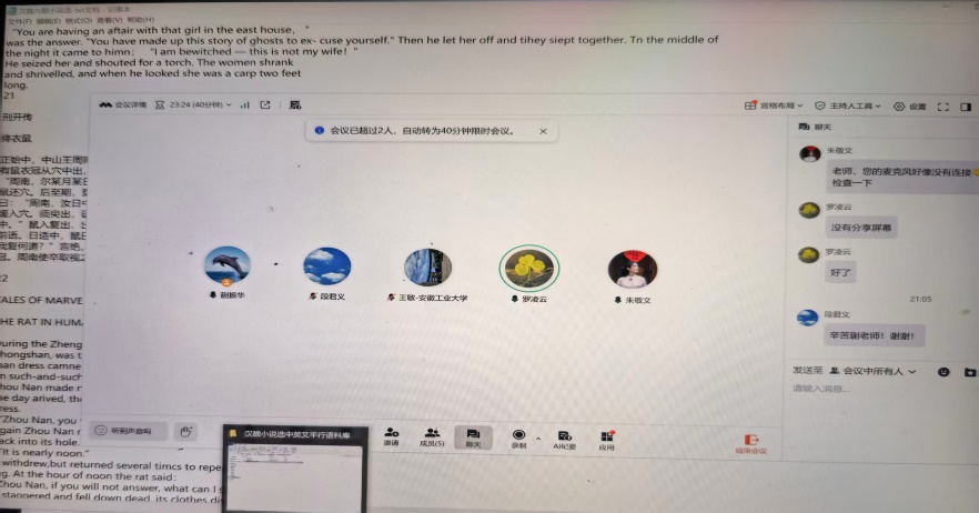 2026年1月23日晚,外国语学院语言学和商务英语研究中心通过腾讯会议举办了第二期语料库沙龙活动。中心副主任蒯振华老师主持并做了题为“《汉魏六朝小说选》中英文平行语料库的创建”的讲座。本项目组成员线上参与了讨论。