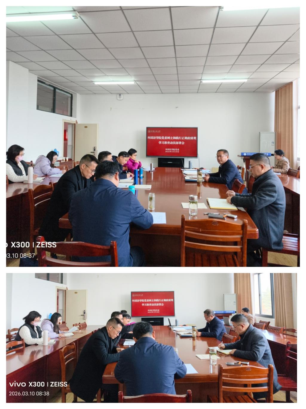 3月10日上午,外国语学院党委召开树立和践行正确政绩观学习教育动员部署会。学院党政领导、党委委员、各党支部书记参会,会议由院党委书记王成勇主持。