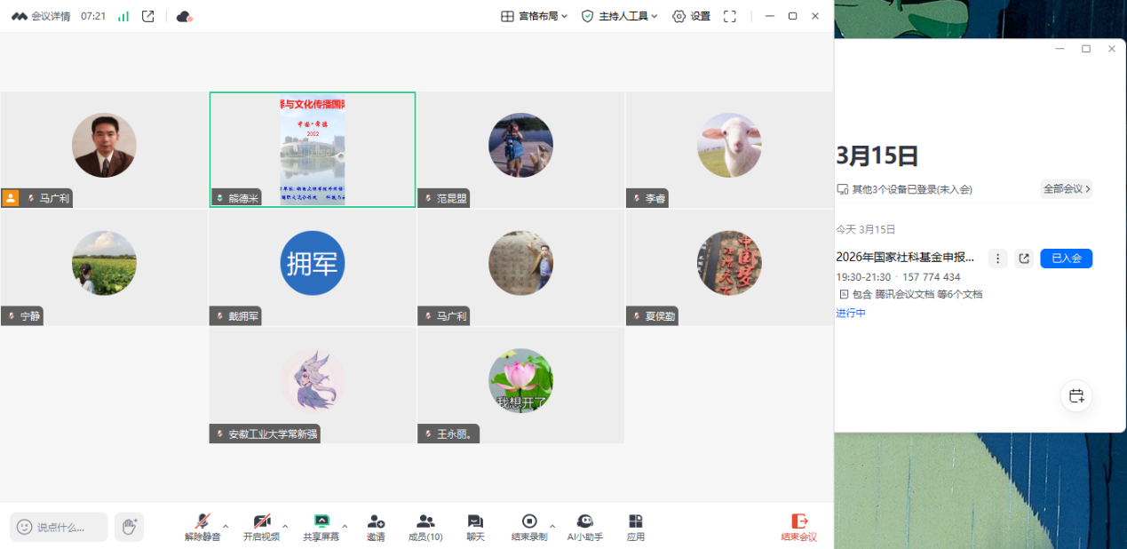 为进一步推进外国语学院2026年国家社科基金项目申报工作,持续打磨申报书质量,3月15日晚上,外国语学院通过腾讯会议召开2026年国家社科基金项目申报评审会,会议邀请西南政法大学教授熊德米对外国语学院2026年国家社科基金项目申报进行指导,各国家社科基金项目申报人参加了本次会议,会议由外国语学院院长戴拥军主持。