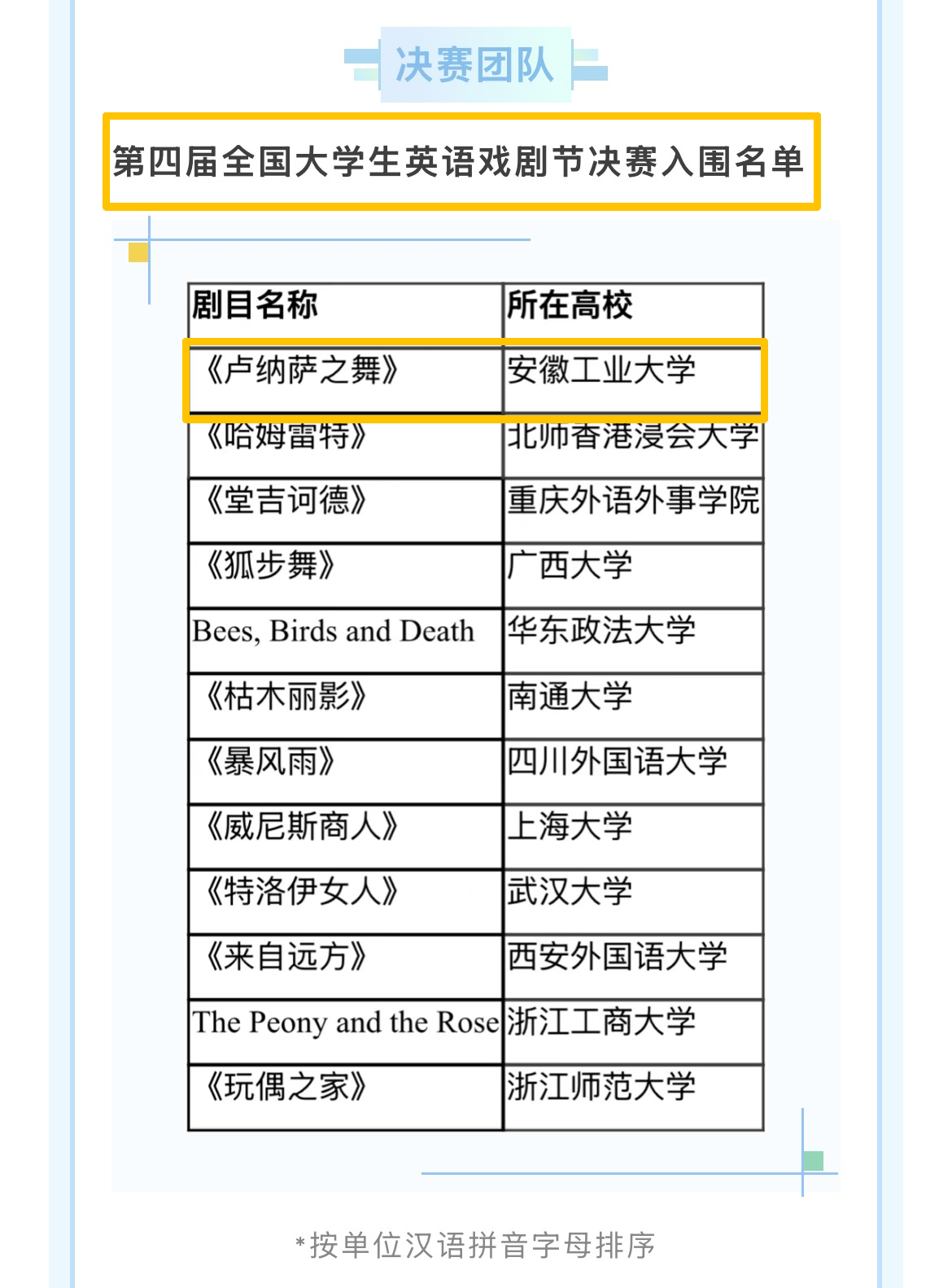 近日,2026年第四届全国大学生英语戏剧节初赛结果公布。由安徽工业大学外国语学院英语专业汪旭林、张蓉、朱敬文、王结、赵梦雅、刘淑鑫6位同学联合完成的英语戏剧《卢纳萨之舞》在全国32支参赛队伍中脱颖而出,成功入围全国总决赛。总决赛将于4月11-12日在四川外国语大学举行,全国共12支队伍获参赛资格。