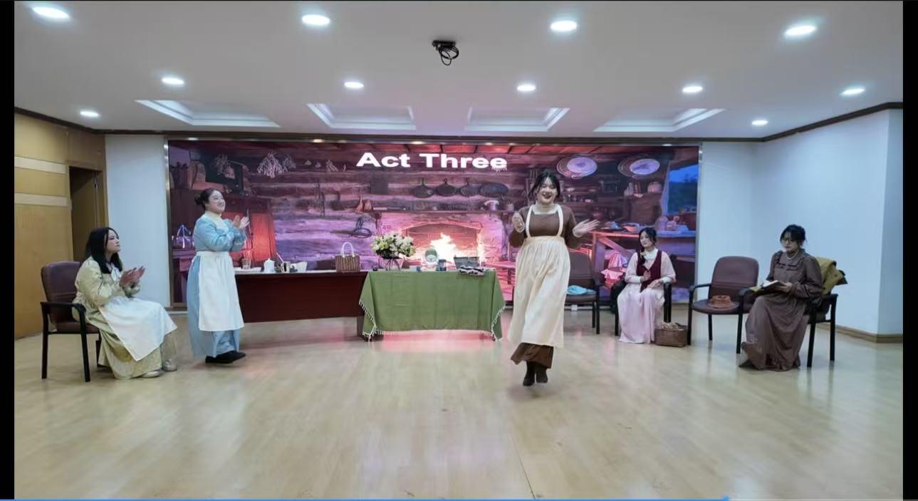 全国大学生英语戏剧节聚焦外语类专业人才培养需求,致力于构建语言实践与人文艺术融合发展的平台,推动英语学习由语言技能向综合素养转化。2025年6月,在外国语学院领导的支持与关怀下,祁亚平、徐丽、刘菱馨、常新强四位老师积极筹划并成立了《卢纳萨之舞》剧组。团队师生经过数月的不懈努力,精益求精打磨剧本、积极排演。于2025年12月受邀参加安徽省第五届比较文学学会“跨文化能力提升工作坊暨实践成果展示活动”,荣获“优秀作品奖”。