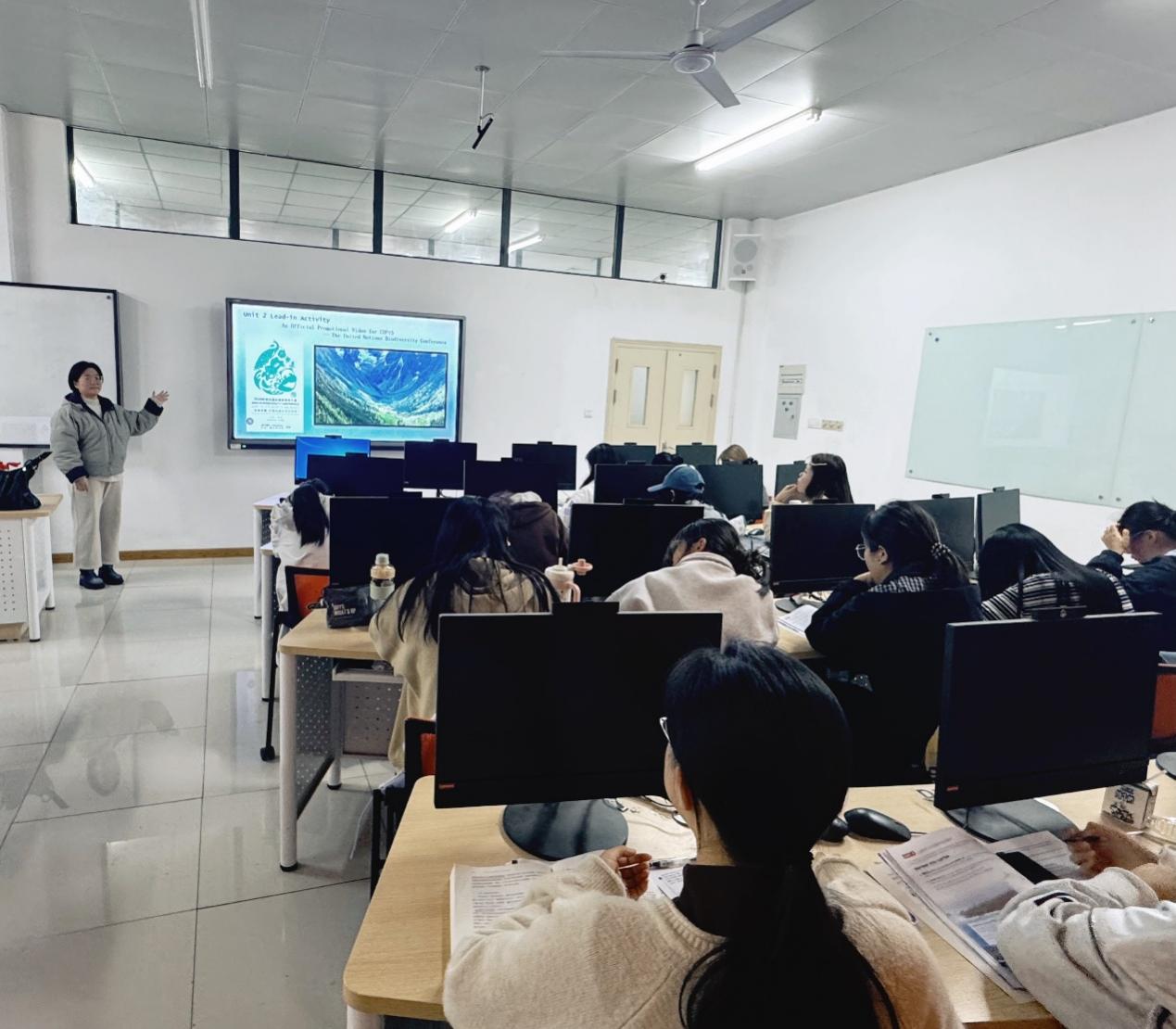 课堂上,学生积极参与互动,围绕气候行动与个体责任展开学习。刘菱馨老师注重启发式教学,鼓励学生从跨文化视角审视环境问题,在语言学习中坚定文化自信,树立人类命运共同体意识。
