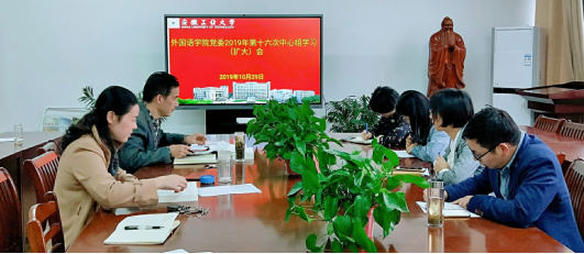 10月29日下午,外国语学院党委在学院会议室召开2019年第十六次中心组学习扩大会,学院领导班子成员、党委委员,全体支部书记、科级干部参加了会议。院党委书记黄宇弦主持会议。