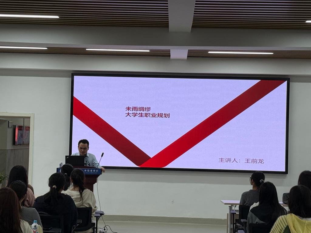 为帮助新生更好地适应大学生活,明晰未来发展方向,外国语学院于10月14日上午在教一401报告厅举办了“启航新征程,规划赢未来”2025级新生职业规划专题讲座。本次讲座特邀我院优秀校友王前龙,为刚刚踏入校园的学子们传经送宝,分享职业成长经验。讲座由外国语学院副院长马广利主持,新生辅导员和2025级新生们参加此次活动。