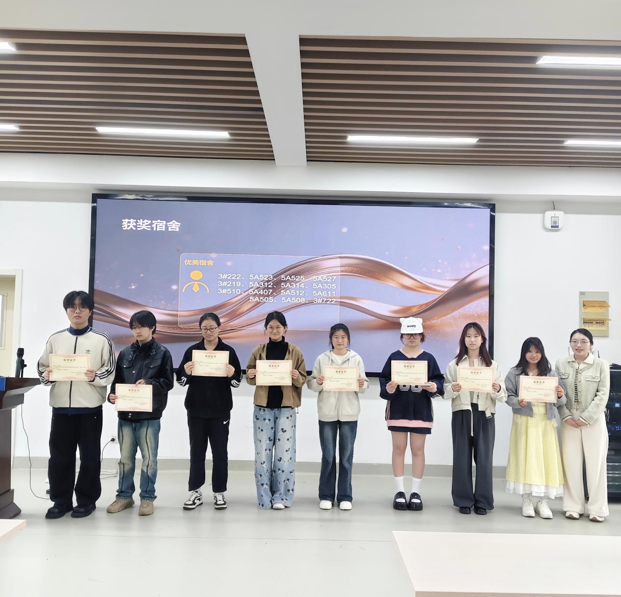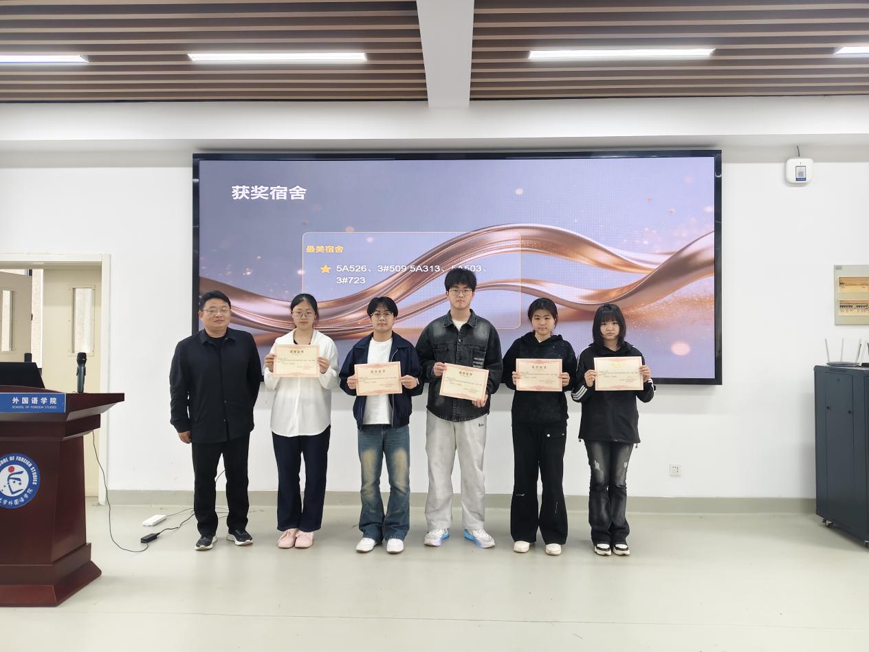 活动期间,评委团深入全院各宿舍,围绕整洁度、创意性、文化氛围及外语特色等维度综合打分,最终评选出最美宿舍5间,优美宿舍15间。表彰大会上,主持人宣读获奖名单,施铜兴及辅导员为获奖宿舍颁发荣誉证书与奖品,肯定了全体宿舍的用心付出,鼓励获奖宿舍发挥榜样作用,带动全院宿舍共同进步。